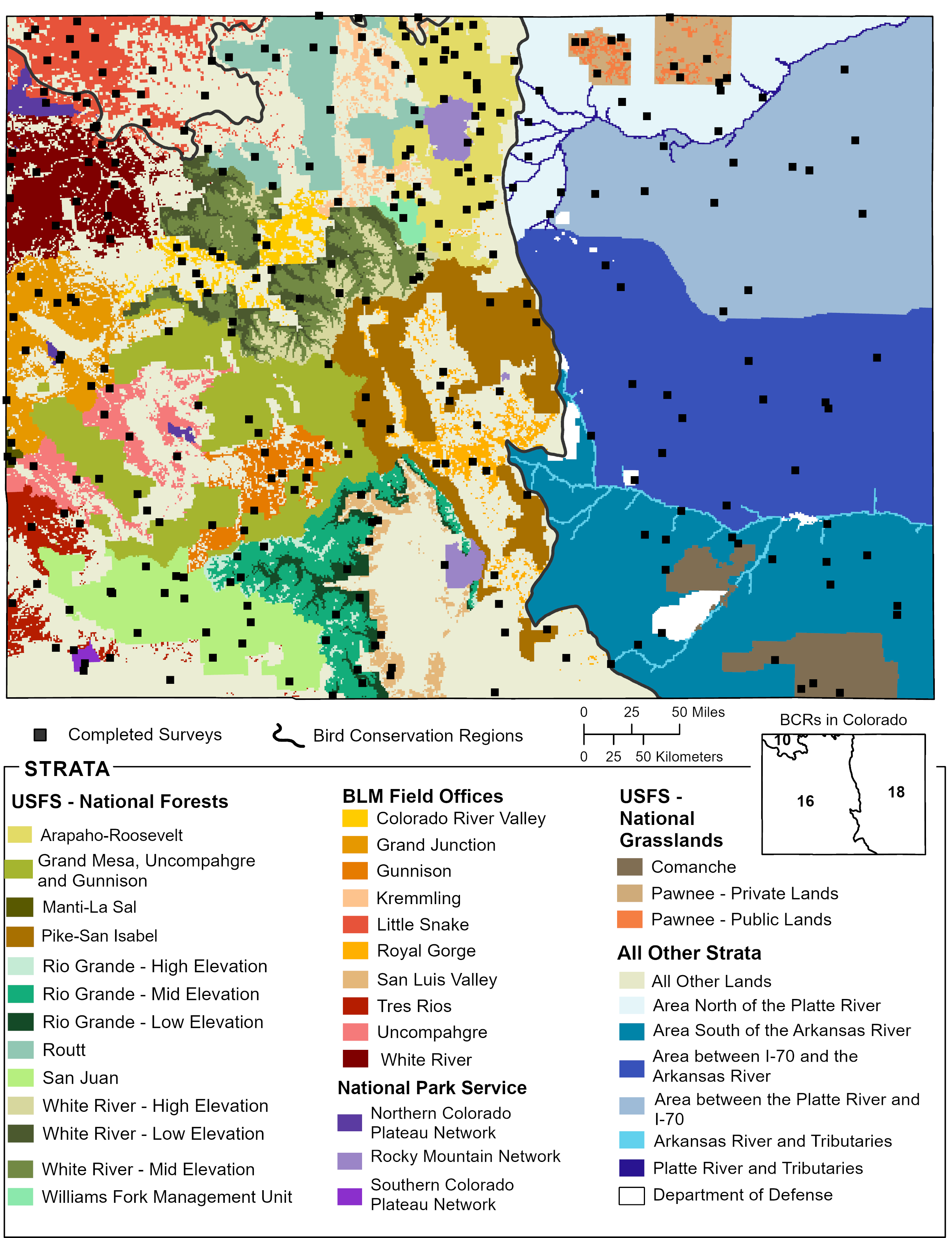 We obtained results for Non-river Lands in Colorado BCR 18 by compiling and jointly analyzing data from eight strata.